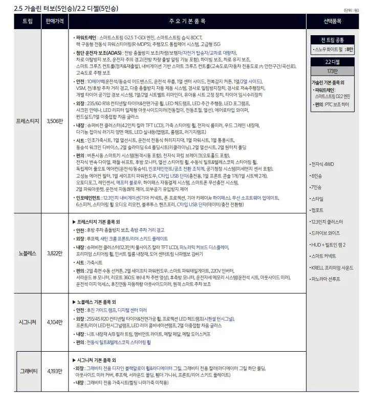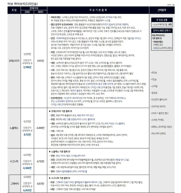 - 프레스티지 3786만 원(2WD) / 4161만 원(4WD)