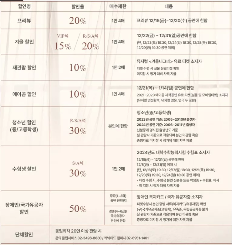 겨울나그네 티켓 구매 시 다양한 할인을 받을 수 있습니다. 특히  2024년 수능수험표를 지참할 경우에는 1인 2매까지 30% 할인도 가능합니다. 정리하면 아래 표와 같습니다.