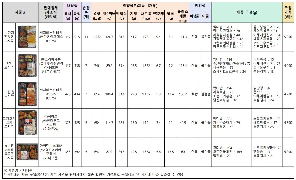 편의점 도시락은 제품별로 내용물 구성, 중량, 영양성분 함량 등에 차이가 있어 종합결과표를 참고하여 소비자 선호도에 맞는 제품을 선택해야 합니다.