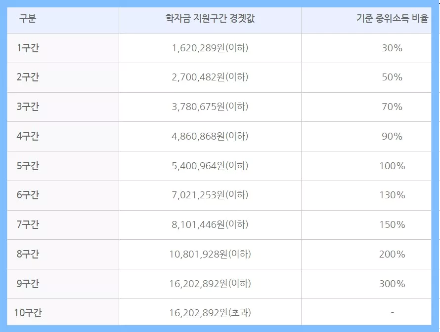 학자금 지원구간 경곗값은 매년 보건복지부에서 발표하는 기준중위소득과 연계하여 학기 단위로 조정되는데요. 2023학년도 2학기 학자금 지원구간 경곗값은 다음과 같습니다.